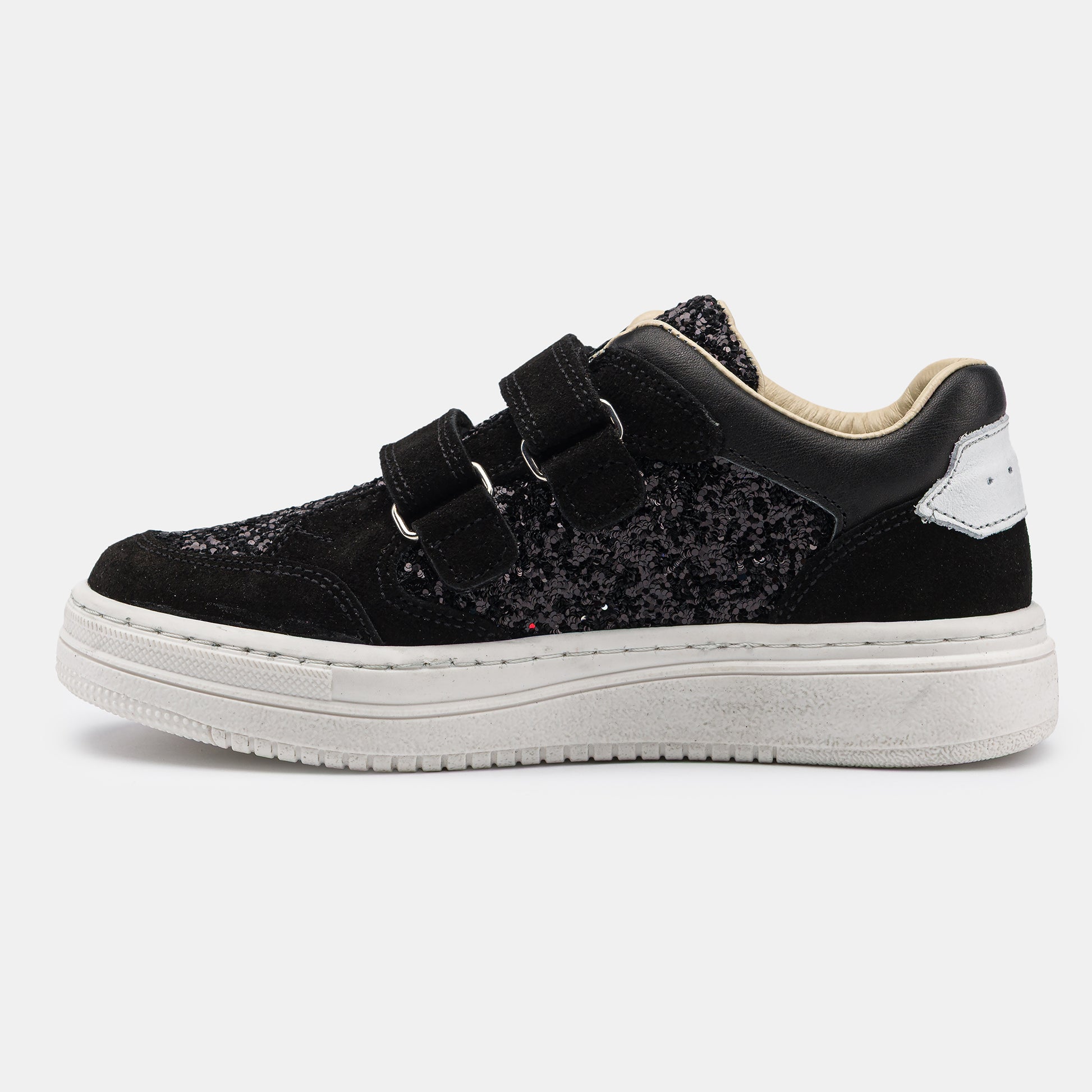 A csillogó, flitteres hatású felület különleges megjelenést ad a modellnek, így nemcsak hétköznapi viseletként, hanem alkalmi outfitekhez is tökéletes választás. A stabil sarokkialakítás támogatja a helyes lábtartást, míg a rugalmas talp biztosítja a természetes mozgást.